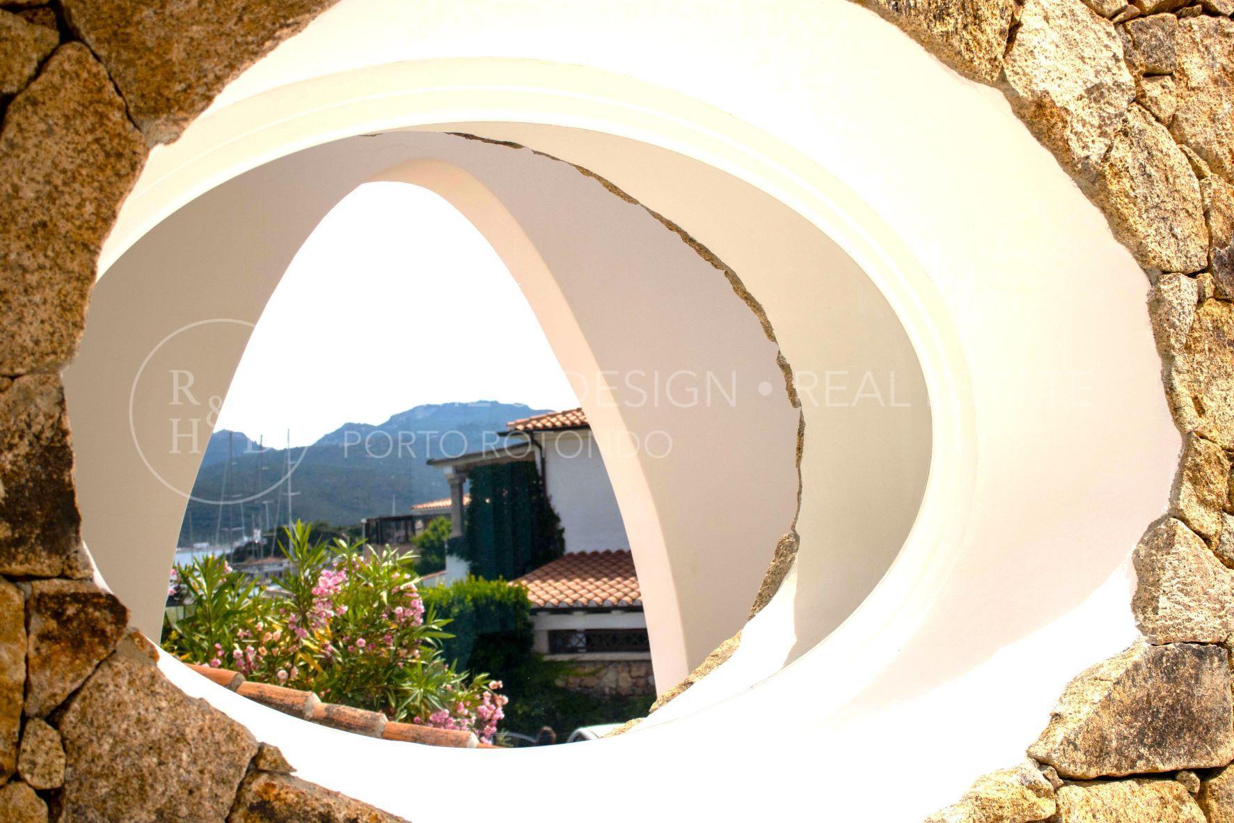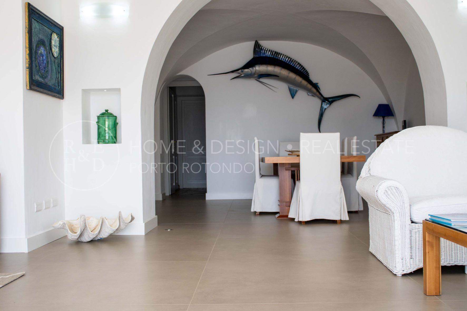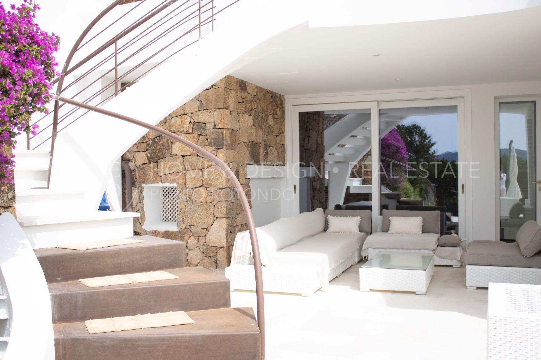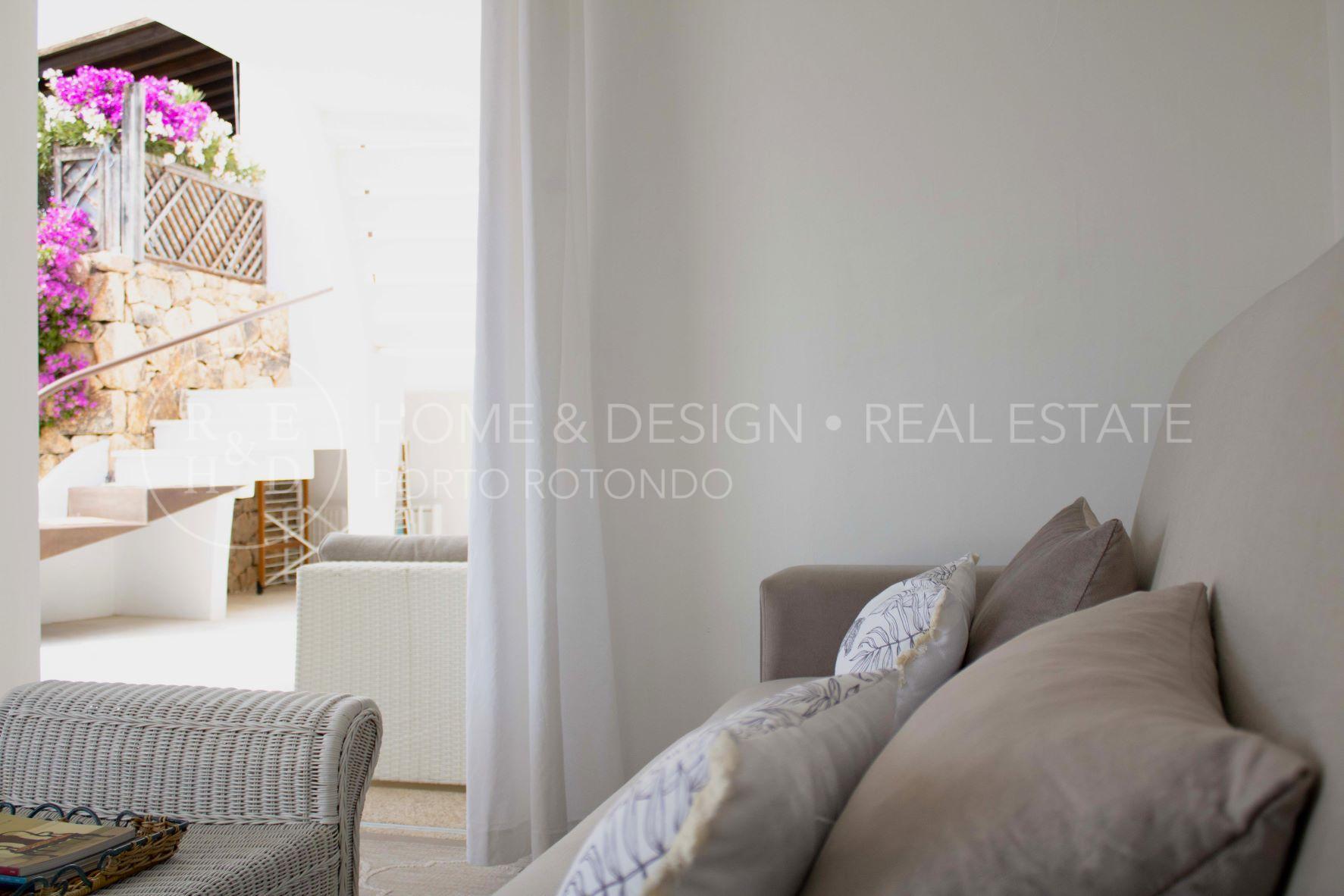 Porto Rotondo, Splendida porzione di villa inserita nel cuore del borgo a pochi passi dal porto ed alle spiagge maggiormente rinomate della zona. La proprietà disponibile per la locazione estiva è disposta su unico livello, terra/tetto e libera su tre lati, risulta composta al piano d'ingresso da living con zona pranzo ed area relax, cucina abitabile dotata di ogni elettrodomestico, quattro camere da letto di cui due camere matrimoniali con bagno en suite, una camera tripla ed una camera doppia di servizio con bagno privato, il quarto bagno dispone di doppio ingresso: area giorno e camera. Verande arredate e corredate, vasca jacuzzi, solarium. ingresso di servizio. Aria condizionata in ogni ambiente. Posto auto in autorimessa.