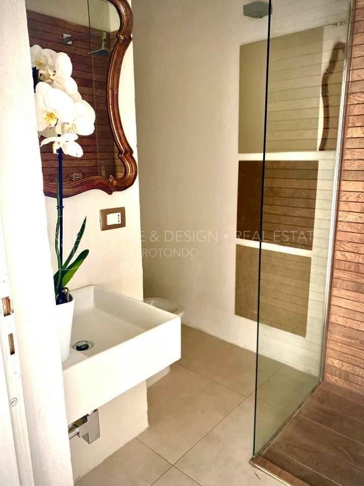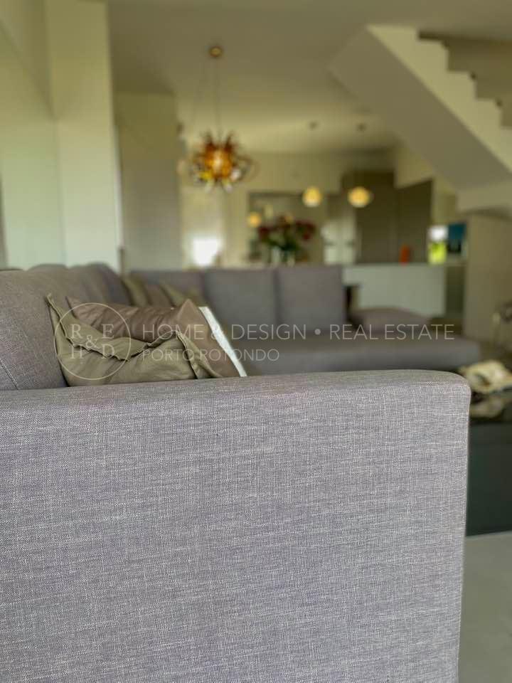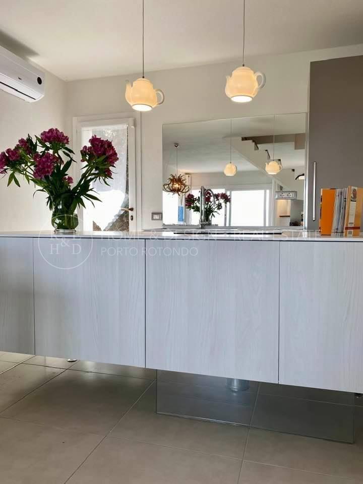 Ampia zona living con angolo cottura a vista, il soggiorno è particolarmente luminoso grazie alla luce che si riflette sui numerosi specchi e finestre che circondano il soggiorno con mobili e materiali estremamente moderni, un bagno per gli ospiti e una stupenda terrazza abitabile con stupenda vista mare.