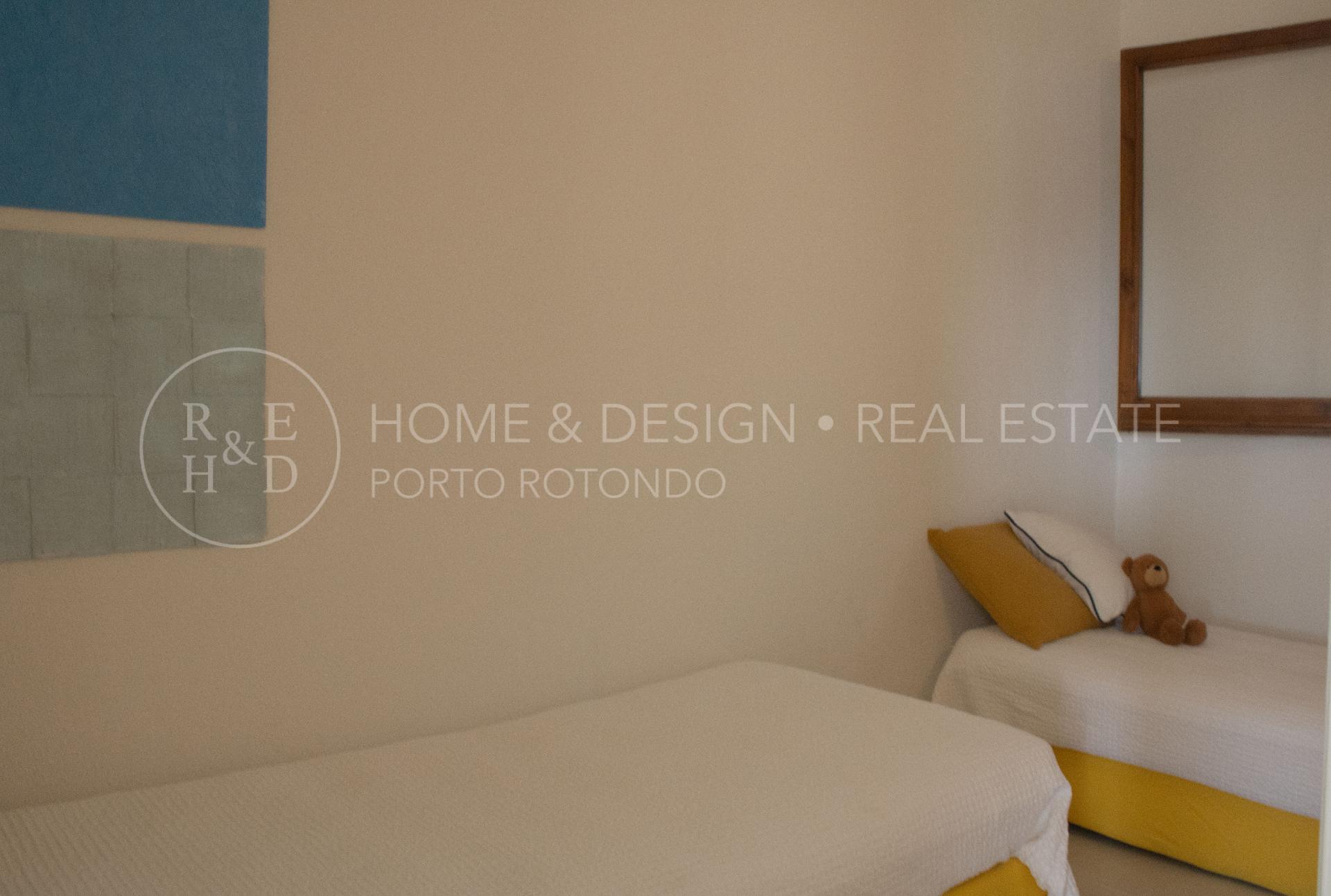 La zona notte, ben divisa, è al primo piano ed è composta da tre camere. Due camere matrimoniali, una delle quali con bagno in camera con vasca, una doppia e bagno con doccia rivestita in teak, la camera padronale gode di una bellissima terrazza con vista sul Golfo di Porto Rotondo.